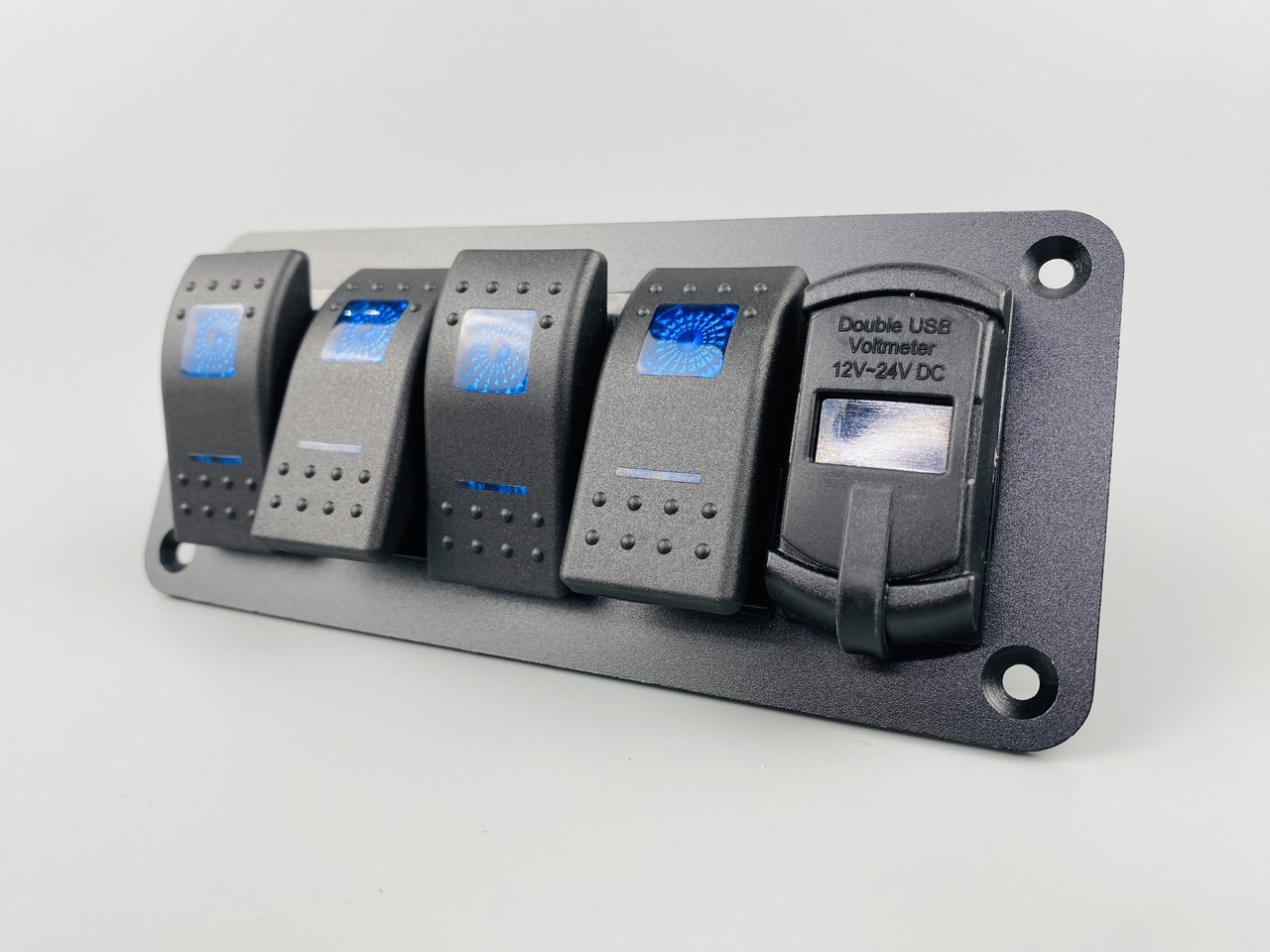 Панель на 5 елементів: 4 клавіші 12 V — 20A/24V-10A; гніздо USB подвійне 5V 4.8A, 12V/24V; вольтметр;